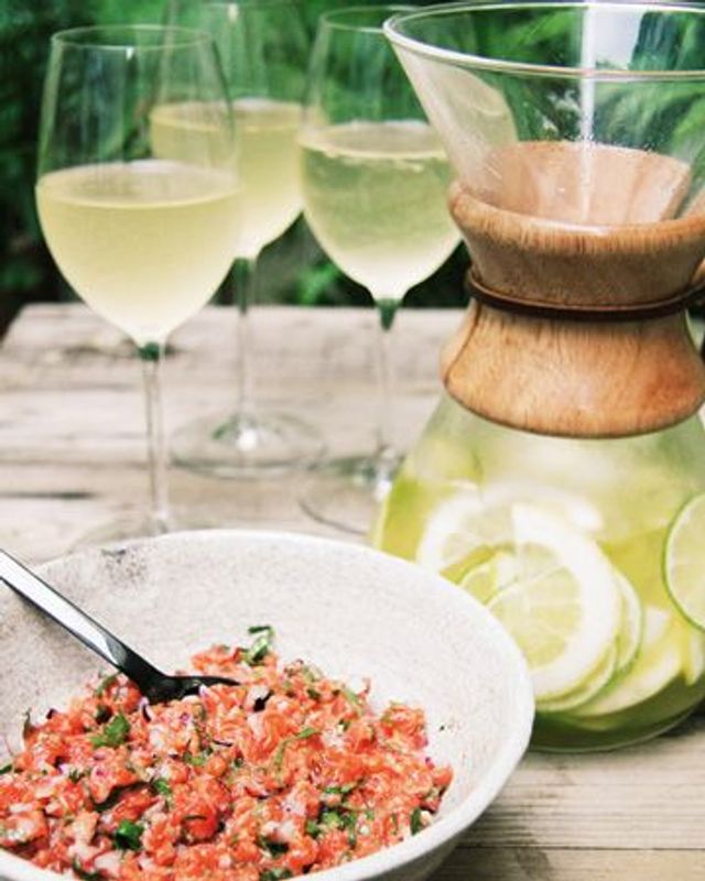 Um nach einem Nickerchen am Nachmittag wieder wach zu werden, eignet sich dieses Rezept für einen Aperitif: Lachstatar mit Champagner-Sangria, das ist leicht, beschwingt und gibt Energie für eine lange Sommernacht. Bitte verwenden Sie für die Sangria einen Blanc-de-Blancs-Champagner, er besteht nur aus Chardonnay und unterstützt die Säure und Fruchtigkeit des gesamten Snacks.