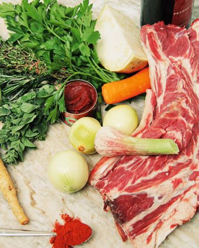 Lammfleisch von Sehnen und zu viel Fett befreien, in walnussgroße Würfel schneiden, mit Salz und Pfeffer würzen. Lammwürfel in Öl anbraten, das Röstgemüse zugeben, mitrösten. Mit Rotwein ablöschen und reduzieren - diesen Vorgang wegen des Geschmacks und der Farbe dreimal wiederholen. Tomatenmark mit anrösten, Mehl und Paprika zugeben, kurz angehen lassen, mit dem Fond auffüllen. Zerdrückten Knoblauch und restliche Gewürze zufügen, eine Stunde schmoren lassen, bis das Fleisch weich ist. Zum Fertigstellen das Fleisch herausnehmen, die Sauce zur gewünschten Konsistenz einkochen lassen, passieren, kalte Butterwürfel unterrühren und das Fleisch wieder hineinlegen.