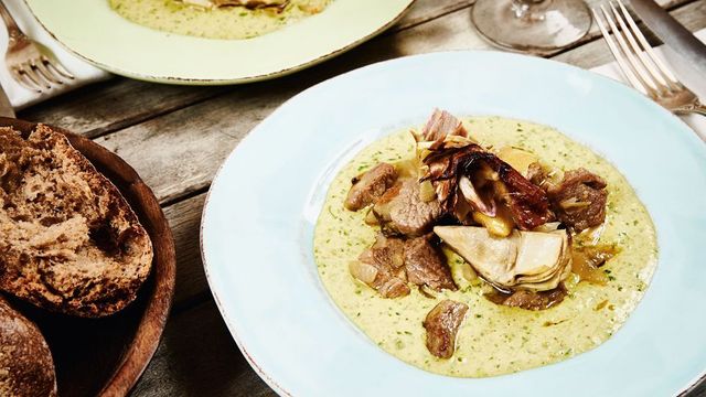 Artischocken ohne Spitzen und harte Blattreihen in Stücke schneiden. In eine Schüssel Wasser den Saft einer halben Zitrone und Mehl geben, Artischockenstücke darin einlegen. 3 EL Olivenöl, 1 ungeschälte Knoblauchzehe, je 1 Zweig Rosmarin und Salbei sowie in mundgerechte Stücke geschnittene Lammschulter in einer Pfanne anbraten, salzen und pfeffern. Wenn das Lamm sich goldbraun färbt, Weißwein zu-geben, 10 Minuten verdampfen lassen, dann mit 200 ml Gemüsebrühe 15 Minuten weiter-kochen. 4 EL Olivenöl, Zwiebeln und Sellerie (beides fein geschnitten), 50 g geschnittenen Jungknoblauch, 2 Zweige Thymian und den Estragon in einer Kasserolle mit 120 ml Gemüsebrühe 5 Minuten auf niedriger Stufe garen. Lamm und Zitronenschalenstücke zugeben, 20 Minuten weiterkochen, nach und nach Gemüsebrühe zugeben. 2 EL Olivenöl, 1 geschälte Knoblauchzehe, geschnittene Champignons, Butter, Salz und Pfeffer in einer Pfanne bei niedriger Temperatur 2 Minuten garen. Pfanne von der Platte nehmen und 30 g Petersilie, Saft einer halben Zitrone und 4 EL vom Bratfond des Lamms zugeben. Geriebenen Parmesan, Sahne, beide Eigelb, die vorgekochte Kartoffel, 1 EL Olivenöl und 50 ml Gemüsebrühe zugeben, mit dem Mixer pürieren. Sauce bei niedriger Temperatur nochmals wenige Minuten kochen - sie soll sämig, aber nicht dickflüssig sein. Abgetropfte Artischocken in Bratpfanne an 4 EL Olivenöl, 20 g Jungknoblauch und 1 Zweig Minze 5 Minuten garen, dann in die Kasserolle mit dem Lamm geben und dort bei niedriger Temperatur weitere 5 Minuten kochen. Zum Schluss 15 g Petersilie zufügen. Auf Tellern mit je 1 Zweig Minze dekorieren.