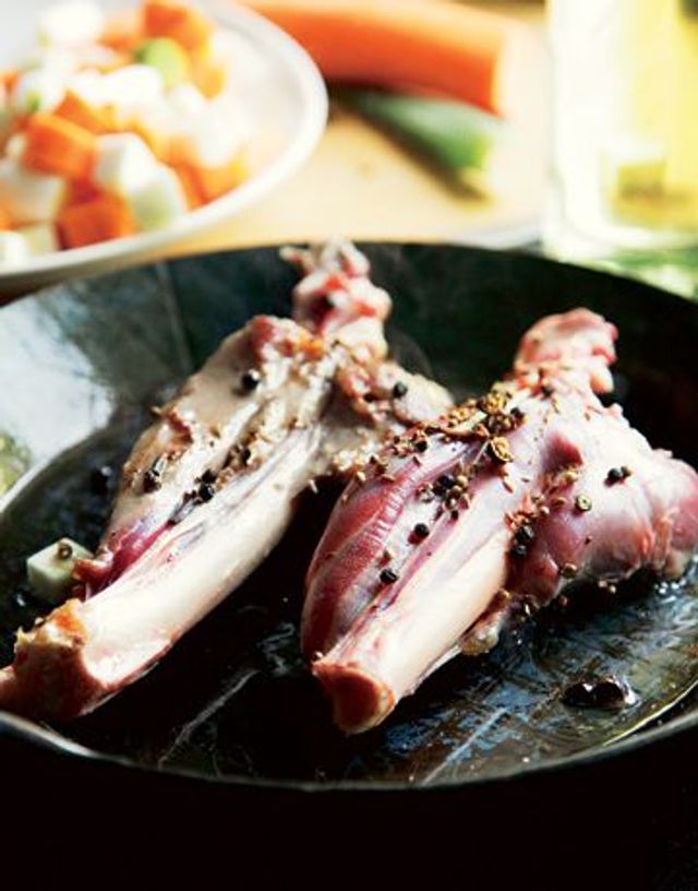 Von Stelzen die nicht essbaren Teile entfernen, Stelzen mit zerstoßenen Gewürzen einreiben, salzen, anbraten, herausnehmen. Mirepoix anrösten. Mit Rotwein ablöschen, auf 1/3 reduzieren, Wildfond angießen, Stelzen hineingeben. 1 Kartoffel in den Fond reiben, zugedeckt ca. 2 Stunden (160 Grad) garen. Stelzen auslösen, den Bratensaft passieren und etwas einreduzieren. Kartoffeln raspeln, salzen, nach 5–10 Minuten gut ausdrücken, in Teflonpfanne goldbraun backen. Lauch- und Zwiebelringe in Öl anschwitzen, Sahne zugeben, abschmecken. Auf das Rösti schichten, mit Blätterteig bedecken. Mit Eigelb bestreichen, bei 200 Grad etwa 20 Minuten goldgelb backen. Mit Stelzen und Fond servieren.