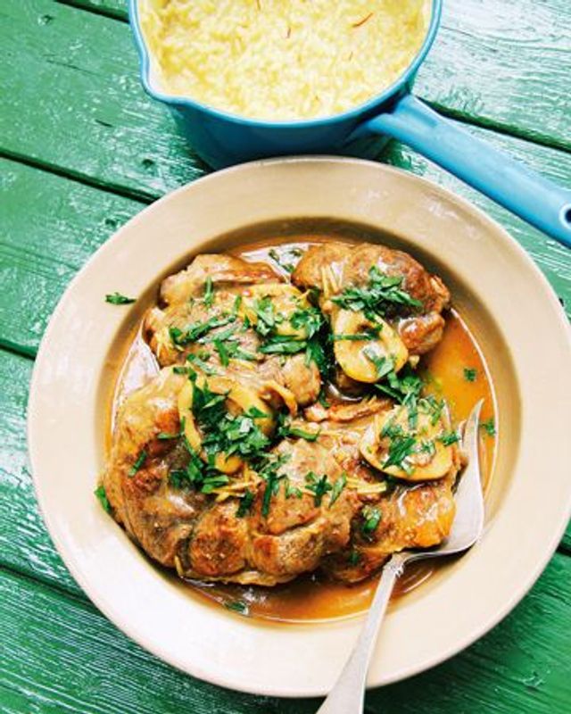 Haut der Haxenscheiben rundherum einschneiden. Fleisch salzen, pfeffern, in Olivenöl von beiden Seiten anbraten, mit Tomatenmark einreiben, zur Seite stellen. In gleicher Pfanne Karotte, Sellerie, Zwiebel anschwitzen. Fleisch zugeben, 5 Min. schmoren. Wein, dann Lorbeer, dann Brühe zugeben. Im Ofen bei 180 Grad 40 Min. abgedeckt schmoren. Fleisch herausnehmen, warm halten. Schmorfond durch Sieb passieren, aufkochen. Butter mit Zeste, Sardellen, Knoblauch, Mehl verkneten, mit Schneebesen in die Sauce einarbeiten. 8 Min. köcheln lassen. Fleisch und Petersilie zur Sauce geben. Für Risotto Knoblauch und Schalotte mit 15 g Butter glasig anschwitzen. Reis zugeben. Umrühren. Sobald Reis etwas Hitze bekommen hat, mit Wein ablöschen. Safran zugeben. Nach und nach heiße Brühe angießen, sodass Reis immer bedeckt ist und leicht köchelt. Dabei hin und wieder vorsichtig umrühren. Nach 15 Min. darf keine Flüssigkeit mehr im Topf sein. Rest Butter und Parmesan unterrühren. Mit Pfeffer abschmecken, abdecken und ca. 2 Min. ziehen lassen.