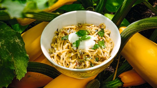 Zucchini-Pasta mit Pistazien und Burrata