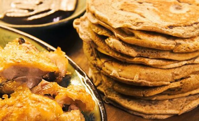 4 Entenkeulen, 2 EL Reiswein, 6 EL Maltose (Malzzucker), Fett zum Ausbacken; 1 Gurke, in Streifen geschnitten, 4 Frühlingszwiebeln, in feine Streifen geschnitten, 200 ml Hoisin-Sauce oder Peking Duck Sauce von Lee Kum Kee Pfannkuchen 4 Eier, 350 ml Milch, 2 EL Ahornsirup, 300 g glutenfreies Mehl, 2 EL Five-Spice-Pulver, 1 TL Backpulver, 1 EL Salz, etwas Butter