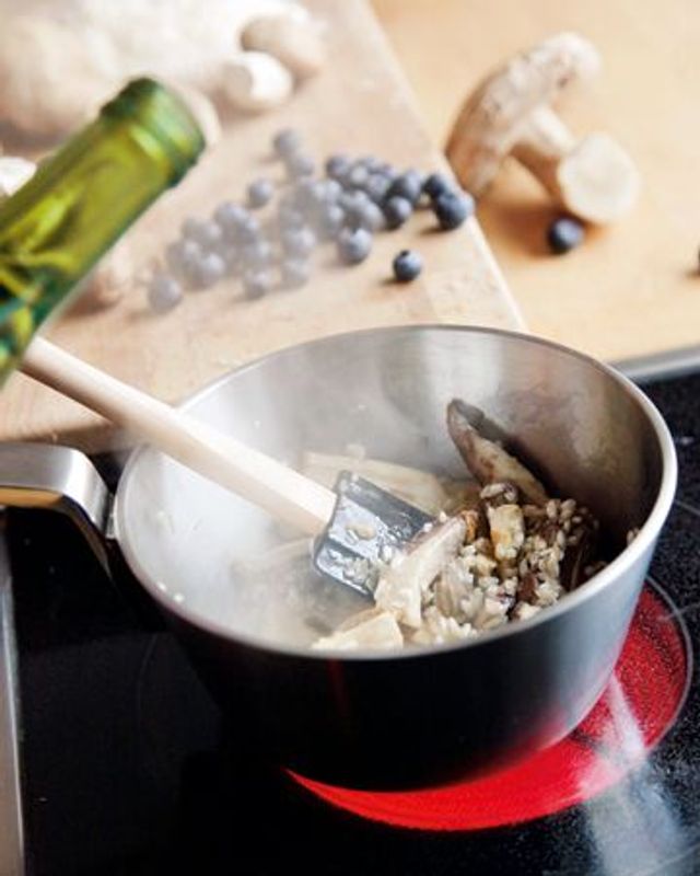 Schalotte und Knoblauch mit 15 g Butter leicht glasig anschwitzen. Steinpilze hinzugeben und warten, bis sie eine Konsistenz erreichen, in der sie den Biss verloren haben. Reis hinzugeben. Umrühren. Sobald der Reis etwas Hitze bekommen hat, mit Weißwein ablöschen. Dann nach und nach heiße Brühe angießen, sodass der Reis immer mit Flüssigkeit bedeckt ist und leicht köchelt. Hin und wieder vorsichtig umrühren. Nach 15 Minuten darf keine Flüssigkeit mehr im Topf sein. Blaubeeren hinzugeben. Rest Butter und Parmigiano unterrühren. Mit Salz und Pfeffer abschmecken. Das Ganze abdecken und etwa
