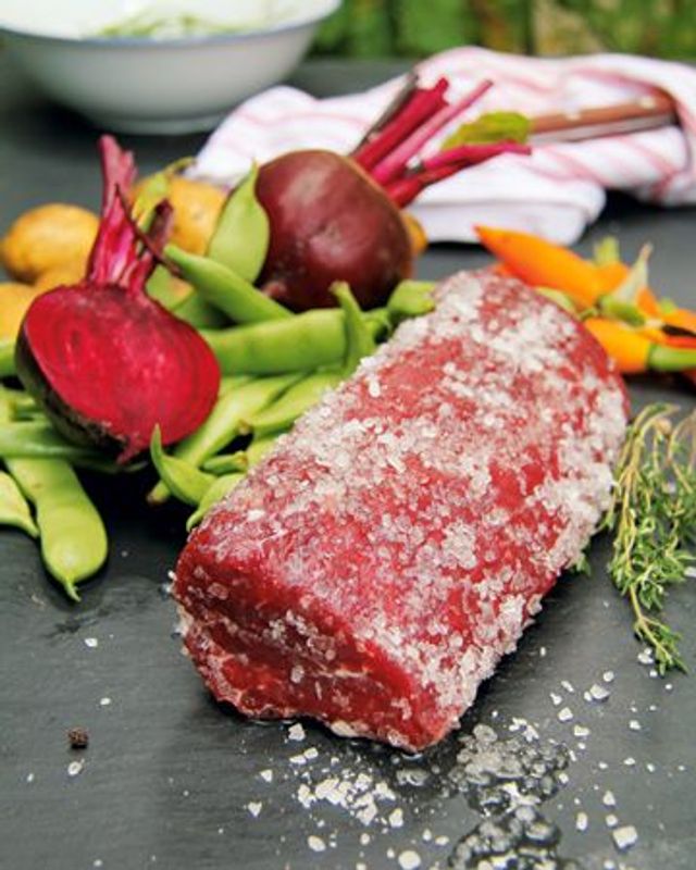 Fleisch dick mit grobem Meersalz einreiben und mit einem Küchentuch zugedeckt 8-12 Stunden im Kühlschrank marinieren. Dann Salz mit Küchentuch abreiben oder abwaschen. Brühe mit den Gewürzen sieden lassen, Lende darin 15-20 Minuten, je nach Dicke, pochieren. Kartoffeln, Rote Beeten klein schneiden, Karotten in ncht zu feine Scheiben. Jedes Gemüse separat in Salzwasser garen, dann zusammen in der aufgeschäumten Butter schwenken. Für ein schönes Farbspiel Rote Beten zum Schluss zugeben. Fleisch mit Gemüse und Sauce Bérnaise anrichten.