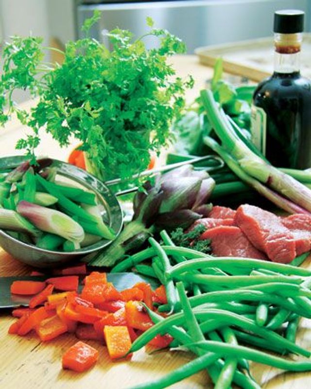 Lamm in Scheiben schneiden, dünn klopfen. Artischocke, Bohnen und Frühlingszwiebeln kurz in Olivenöl angehen lassen. Paprika und zuletzt Tomaten zufügen. Mit Salz, Pfeffer, Zucker, Balsamico abschmecken, kurz vor dem Servieren frisch gehackte Kräuter und Knoblauch zugeben. Fleisch in Olivenöl vorsichtig rosa braten, salzen, pfeffern, mit etwas Bratenjus angießen. In die vorbereiteten Ringe abwechselnd Fleisch und Gemüse schichten, vorsichtig andrücken, sodass ein Turm entsteht; mit Jus angießen und in die Mitte der vorbereiteten Teller geben. Nun die Ringe vorsichtig abziehen, sofort servieren.