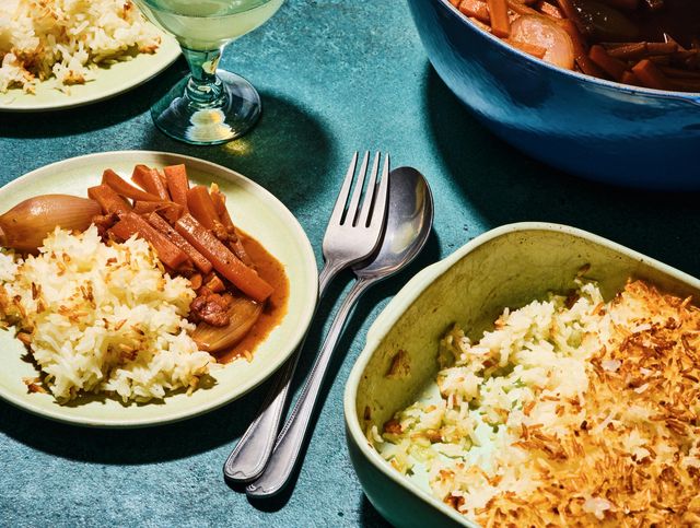 »Manche mögen’s kross. Da empfiehlt sich dieser Reis aus dem Backofen. Er ist knusprig und fluffig zugleich und schmeckt einfach köstlich. Zum Beispiel zu einem intensiven Ragout aus Karotten.«