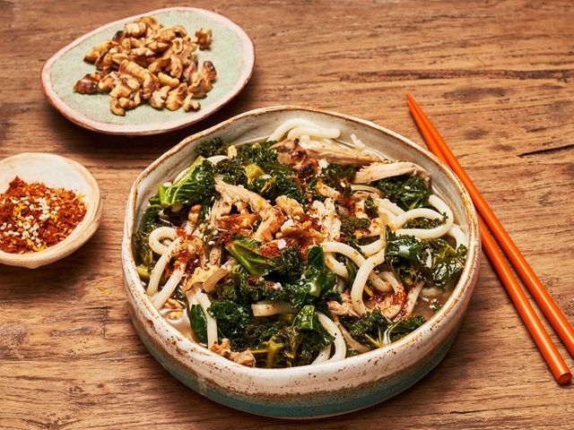 Im Anschluss Udon auf vier Teller verteilen und die Topping-Eier jeweils mittig darüber aufschlagen. Mit extra schwarzem Pfeffer und ein paar Bonitoflocken garnieren und warm genießen.