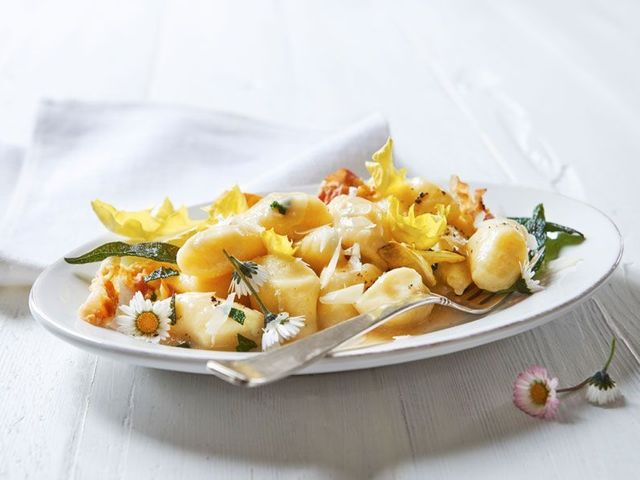 350 g rote Kartoffeln (rotschalig), 500 g Kürbis, 4 Zweige Thymian, 6 EL Olivenöl extra vergine, Salz und Pfeffer, 1Prise Muskatnuss, 3 EL geriebener Parmesan, 150 g Mehl (Type 550), 50 g Kartoffelstärke, 1 Ei, 200 g Steinpilze, 80 g frische weiße Trüffeln (oder Blauschimmelkäse), 1 Knoblauchzehe, 1 EL Sahne, 10 g Petersilie, etwas Butter