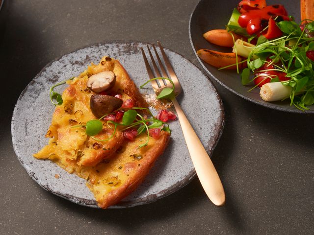 »Torta di Ceci oder Farinata ist eigentlich eine italienische Spezialität, im ›SALON rouge‹ gab es sie kürzlich als Personalessen. In Italien wird diese Art Pizza oder Torta aus Kichererbsenmehl gern als Streetfood gegessen und ist vor allem in Ligurien bekannt. Die Petersilien-Gremolata mit Ingwer, Sojasauce und Sesam verleiht dem Gericht eine japanische Note. Die Italiener mögen mir das verzeihen.«