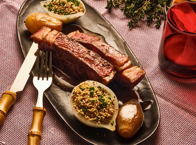 Ribeye-Steak mit geschmorten und gefüllten Zwiebeln