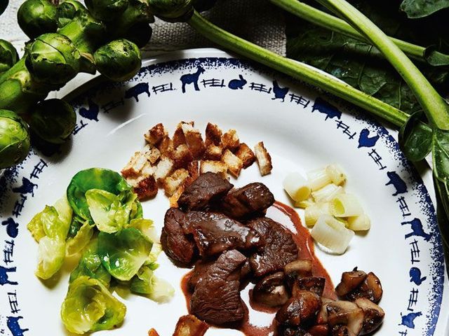 Fleisch waschen, trockentupfen und in eine Terrinenform legen. Zwiebeln, Karotten, Sellerie in Würfel schneiden, mit 1 Zweig Rosmarin und den Gewürzen zum Fleisch geben. Rotwein dazugießen und Fleisch bei geschlossenem Deckel 3 Stunden marinieren. Fleisch aus dem Topf nehmen und mit Schweineschmalz und 2 EL Olivenöl einreiben. Dann in einer Pfanne mit 2 EL Olivenöl, 1 Knoblauchzehe und 1 Zweig Thymian anbraten, salzen und pfeffern. Den Wein der Marinade absieben und bei mäßiger Hitze 10 Minuten mit 1 EL Zucker einkochen. In einem Gusseisentopf das Gemüse aus der Marinade in 3 EL Olivenöl 10 Minuten garen, salzen und pfeffern. Angebratenes Fleisch und eingekochten Rotwein dazugeben und alles für 2 Stunden bei niedriger Hitze garen, dabei immer wieder etwas Gemüsebrühe zugeben. Fleisch herausnehmen und warm stellen. Gemüse abpassieren und die Sauce 5 Minuten köcheln, Maisstärke dazugeben, damit sie eindickt. Blätter des Wirsings vom Strunk brechen, waschen und in ungesalzenem Wasser al dente kochen. Dann in einer Bratpfanne an 2 EL Olivenöl, 1 EL vom Kochwasser, 1 Knoblauchzehe und 1 Zweig Rosmarin einige Minuten garen, salzen und pfeffern. Pinienkerne in einer Pfanne ohne Fett goldbraun rösten. Den Braten in Scheiben schneiden. Sauce über die Scheiben gießen, Wirsing dazu anrichten. Pinienkerne über das Gericht streuen. Die Teller nach Belieben mit einem Lorbeerblatt und einem Streifen Olivenöl garnieren.