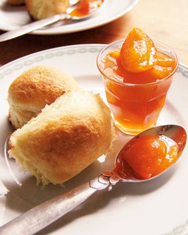 Mehl in Schüssel sieben, Mulde hineindrücken, Hefe einbröckeln, lauwarme Milch und Sahne dazu, mit etwas Mehl einen Vorteig glattrühren. An warmem Ort 20 Minuten gehen lassen. Zimmerwarme, gewürfelte Butter um die Mulde auf dem Mehl verteilen, ebenso Rum, Vanille, Zucker. Eier zugeben, alles mit einem Holzlöffel zu glattem Teig verarbeiten. 20 Minuten gehen lassen. Auf bemehlter Fläche 2 cm hoch ausrollen, Ringe ausstechen, Kugeln formen, in gebutterte, mit Zimtzucker ausgestreute Form setzen. An warmem Ort 20 Minuten gehen lassen, mit flüssiger Butter bestreichen, bei 180 Grad im Ofen 30 Minuten backen. Lauwarm auf ein Blech stürzen. Marillen waschen, vierteln. Zucker karamellisieren, mit Zitrone ablöschen, Weißwein zugeben. Vanilleschote, Zimt, Zesten zufügen, mit Stärke abziehen, Marillen einlegen, aufköcheln. Mit Likör und Schnaps verfeinern und zu den noch lauwarmen Rohrnudeln servieren.