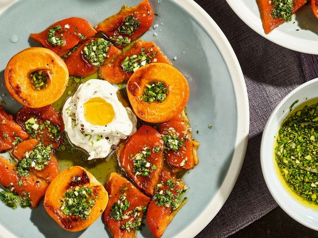 Ofen auf 200 Grad Ober- und Unterhitze vorheizen. Paprikaschoten auf ein mit Backpapier belegtes Blech legen und 30 bis 40 Minuten backen, bis die Schale schwarz zu werden beginnt, dabei etwa alle 10 Minuten wenden. Aprikosen halbieren und entkernen. In einer heißen Pfanne in etwas Öl nur auf den Schnittflächen kurz scharf anbraten, sodass sie karamellisieren. Mit der Schnittfläche nach oben auf einen Teller legen und abkühlen lassen. Gegarte Paprika in eine Schüssel geben, mit einem Teller abdecken und ein wenig abkühlen lassen.