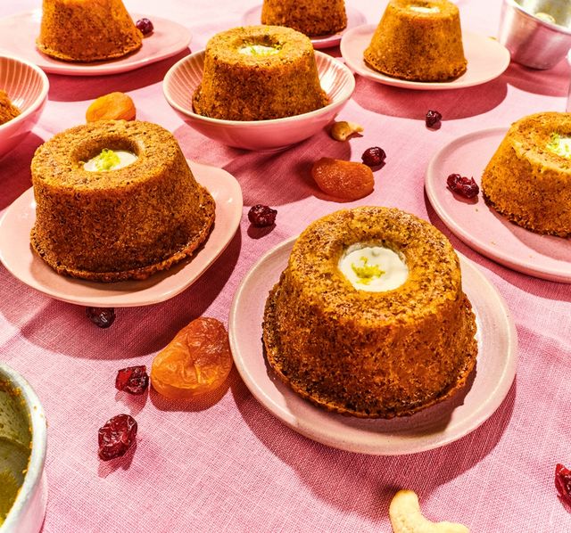 Zur Vorbereitung den Backofen auf 160 Grad Ober-/Unterhitze vorheizen, die Savarin-Formen mit zerlassener Butter ausstreichen und mit dem griffigen Mehl ausstauben. Für die Savarins dann das Weizenmehl, den Zucker, das Backpulver, Natron, die gehackten Nüsse sowie Ingwer und Lebkuchengewürz in einer Metallschüssel mischen. In einer zweiten Metallschüssel die gehackten Trockenfrüchte, die geraspelten Karotten, den Abrieb der Orange, die zerlassene, zimmerwarme Butter und die Eier mit einem Gummispatel gut verrühren. Zutaten der ersten Schüssel in zwei Etappen mit denen der zweiten vermengen. Die Masse in einen Spritzbeutel füllen und die Savarin-Formen damit füllen. Im vorgeheizten Ofen 25 Minuten backen (mit einem Holzspieß eine Backprobe machen).