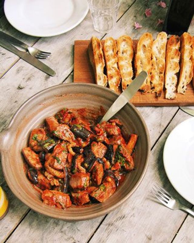 Apfelsaft aufkochen, Rosinen hineingeben, Deckel auf den Topf, 1 Stunde ziehen lassen. Rosinen aus dem Sud nehmen, kalt stellen. Auberginen in Stifte schneiden, in der Butter goldbraun braten, im Ofen bei 80 Grad warm halten. Lammwürfel in einem großen Topf mit Knoblauchöl medium braten. In den Ofen zu den Auberginen geben. Tomatenmark in den Topf mit Bratensaft und Knoblauchöl geben und darin bei mittlerer Hitze anschmoren. Rosinen, Auberginen, Lamm und Pistazien in den Topf geben, vorsichtig verrühren, mit Fleur de Sel und Harissa-Paste abschmecken. Basilikum darüber geben. Weißbrot-Scheiben auf eine Platte legen, darauf den warmen Auberginensalat häufen.