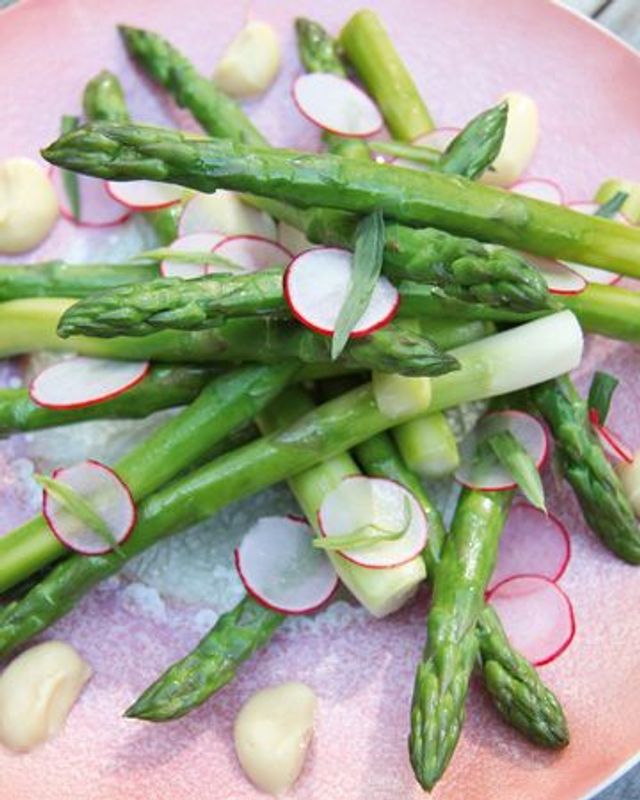 Für das Spargelwasser jeweils 150 g Spargel nacheinander in dem mit Salz und Zucker gewürzten Wasser kochen, dann haben Sie im Anschluss einen feinen Spargelsud. 0,1 l des Suds abschöpfen, mit Reisessig und Speiseöl mixen und damit den gegarten grünen Spargel marinieren. Helle Misopaste mit der Mayonnaise zur Sauce verrühren. Radieschen ganz kurz in kochendem Wasser blanchieren, mit Reisessig marinieren und kalt stellen. Zum Anrichten die Spargelstangen als Mikado legen, mit den Radieschen und Estragonblättern dekorieren. Teller mit Punkten aus Miso-Mayonnaise dekorieren.