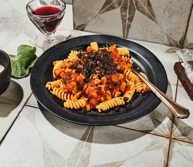 Nudelwasser aufsetzen (1 TL Salz pro Liter). Den Pumpernickel mit den Fingern fein zerbröseln. In einer großen Pfanne restliches Öl erhitzen, Pumpernickel, Fenchel, zwei Thymianzweige und Lorbeerblätter hineingeben. Leicht salzen und langsam 20 Minuten braten. Die Nudeln al dente kochen. Topf aus dem Ofen nehmen, Backpapier und Kräuter entfernen. Die Hälfte vom gerösteten Pumpernickel in die Sauce geben, mit Pfeffer abschmecken. Wem die Sauce zu dick ist, kann etwas Nudelwasser einrühren. Nudeln abgießen und mit einem Dritttel der Sauce mischen.