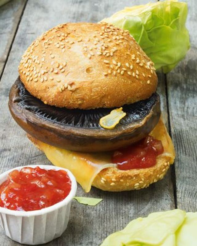 Die Sesambrötchenhälften mit den Käsescheiben belegen und so lange auf den Grill geben, bis der Käse zu zerfließen beginnt. Butter in einer Pfanne mit Knoblauch und ordentlich Salz zerlassen. Die Pilze darin bei niedriger Temperatur garen und alle 2 bis 3 Minuten wenden. Die Kopfsalatherzen mit der Kondensmilch marinieren. Alle Relish-Zutaten verrühren, mit Kaltsaftbinder andicken. Salatblätter, Pilze und Relish auf die Sesambrötchenhälften schichten.