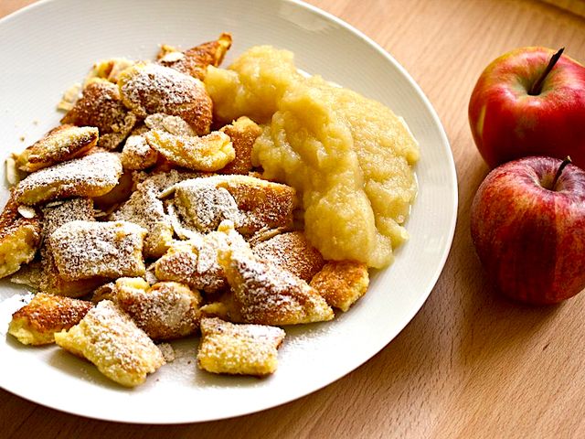 5. Zum Servieren den Kaiserschmarrn am Tisch mit weiterem Puderzucker bestäuben und das Apfelmus dazu anrichten.