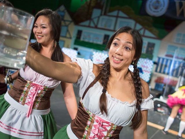 Und so tut jeder das seine. Hier stellt sich wer auf seine Bank, um aus seinem Schuh Bier zu trinken und für wenige Sekunden die Aufmerksamkeit des ganzen Zeltes auf sich zu ziehen, dort steht ein Promi in der Menge, um Selfies mit Betrunkenen zu machen. Schon erstaunlich, wie die Leute selbst auf einen schon lange nicht mehr wichtigen Ex-Fußballer wie Kevin Kuranyi reagieren, den ich hier mal gesehen habe. Und als Arnold Schwarzenegger mit seinem Sohn ins Zelt kam und auf der Empore Platz nahm, wurde allen, auch den Breznverkäufern, sofort der Zutritt dorthin verweigert. Drag-Queens stolzieren durch die Gänge, Politiker sitzen neben Journalisten. Ob Promi oder nicht, man begegnet sich. In einer Reihe macht ein Mann in Lederhosen seiner Freundin einen Heiratsantrag. Das Publikum grölt, jubelt. Das Paar umarmt sich und stößt dann mit dem Rest des Tisches auf das Ja-Wort an. Ob sie sich wohl hier, genau an diesem Tisch, kennengelernt haben?