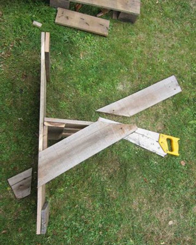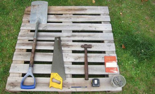 1 Säge. 2 Nägel. 3 Schleifpapier. 4 Hammer. 5 Maßband. 6 Europalette.