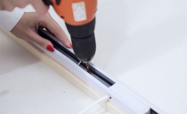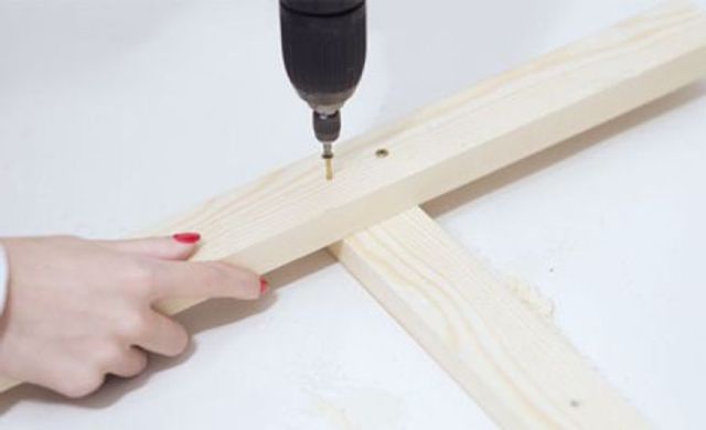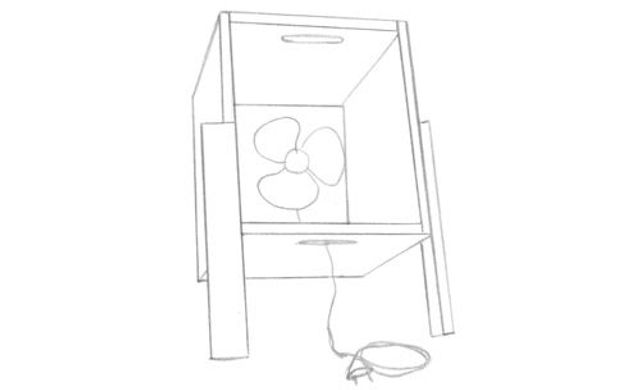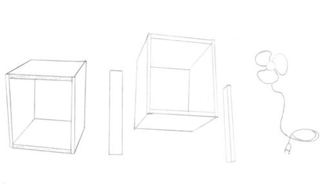 1 Holzlatten für Standfüße. 2 Schrauben. 3 Holzzuschnitte für Box. 4 Bohrmaschine. 5 Tischventilator.