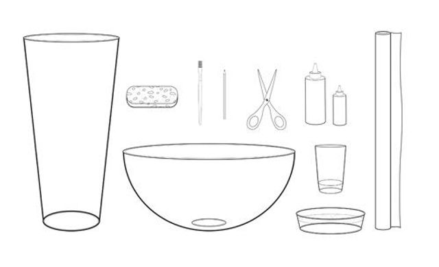 1 Schere. 2 Spachtel. 3 Schwamm. 4 Glasschüssel. 5 Papier. 6 Holländisches Wachstuch. 7 Glasvase. 8 Klebestoff.