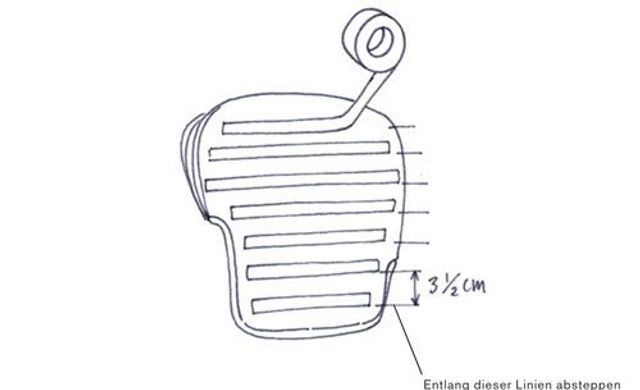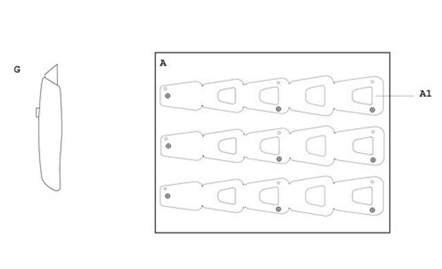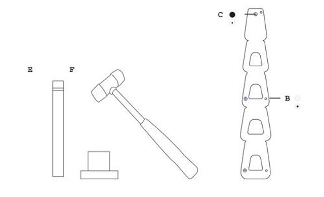 1 Lochzange. 2 Nietgerät. 3 Hammer. 4 Geodreieck. 5 In Muster geschnittene Pappstreifen. 6 Nieten. 7 Cutter.