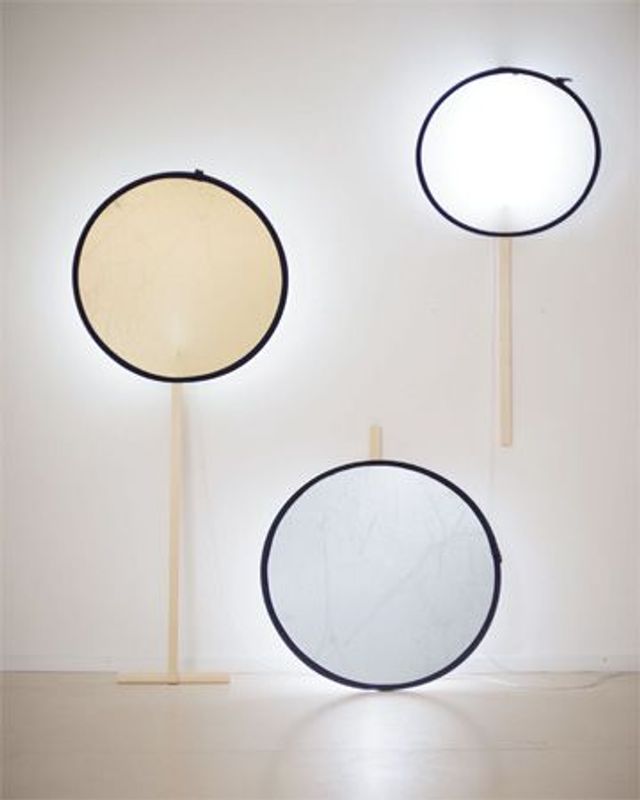 Ein Stuhl ist ein Stuhl. Er kann aber auch als Kleiderhänger oder Stehleiter benutzt werden. Die Zweckentfremdung bestehener Produkte ist eine beliebte Strategie der DIY-Kultur, so auch bei diesen Leuchten, deren wichtigstes Bauteil ein Lichtreflektor für Profi--Fotografen ist. Reflektoren sind Werkzeuge, um fotografische Szenen richtig auszuleuchten, es gibt sie in Silber, Gold oder Weiß. Für Ana Relvão und Gerhardt Kellermann wurden sie zur Basis einer Leuchtenfamilie. »Uns war wichtig, es so simpel wie möglich zu halten, nur so bleibt eine Idee auch offen für Interpretationen. a, b, c sind unsere Versionen, wir freuen uns aber auch, wenn sich jemand an d, e oder f versucht.«