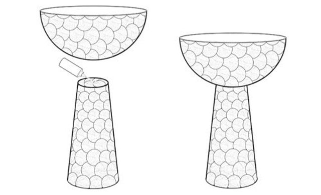 Dieses Objekt hat zwei Gesichter: Je nachdem, wie man es aufstellt, ist es Vase oder Schale. Was nicht weiter verwundert, denn die beiden wichtigsten Bestandteile sind eine Glasvase und eine Glasschale, wie es sie in jedem Küchenschrank, auf dem Flohmarkt oder bei Ikea gibt. Der Trick ist, sie zu kombinieren. Um ein Patchworkmuster wie auf dem Bild herzustellen, braucht man buntes Wachstuch, eine Schere und jede Menge Klebstoff. So entsteht ein einzigartiges, spontanes Kunstwerk, ein Readymade, wie Burks sagen würde. »Was mich immer wieder herausfordert bei DIY-Projekten, ist es, Handwerk so ›unhandwerklich‹ wie möglich aussehen zu lassen.«