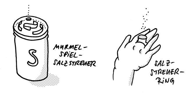 04. Juli 2017Aus Heft 26/2017Design & WohnenDer SalzstreuerGewöhnliche Salzstreuer findet der Designer Sebastian Jung langweilig und hat sich deshalb Alternativen ausgedacht - zum Beispiel einen Teller mit zuschaltbaren Salzschleusen.Von: Sebastian Jung Meistgelesen diese Woche: »Um diesen Lebkuchen herunterzukriegen, brauche ich einen richtig guten Glühwein«In den Läden türmen sich die Honig- und Elisenlebkuchen. Welche taugen was? Das haben wir den Konditormeister Bernd Siefert gefragt. Sein Fazit: Der Kakaoanteil bei der Glasur ist derzeit überall zu niedrig. Trotzdem hat er klare Favoriten.Illustration: Sebastian Jung Rechte am Artikel können Sie hier erwerben. Aus Heft 26/2017Design & WohnenSalzDesignWohnen und DesignStartseite > Themen > Design & Wohnen > Der Salzstreuer