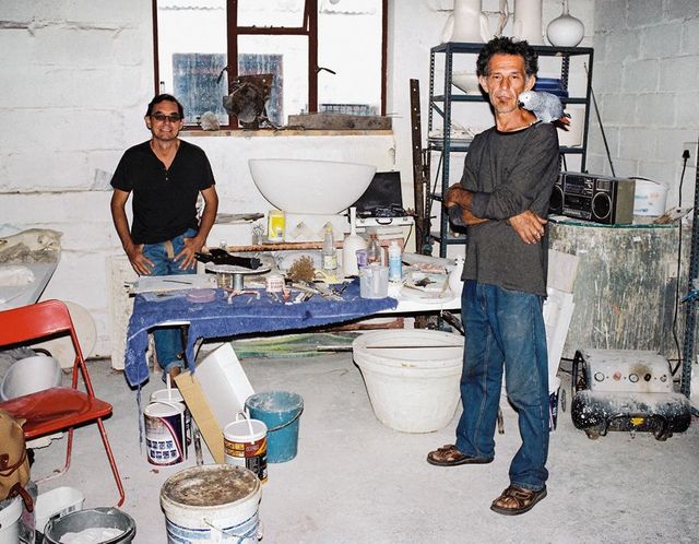Also loten sie die Grenzen des Möglichen aus, zum Beispiel mit sechs Meter hohen Wand-installationen oder riesigen Kronleuchtern. Gebrannt wird alles, was sie relevant finden. Das kann auch mal ein Porzellangartenzwerg mit überdimensionalem Revolver sein – als augenzwinkernder Kommentar auf die südafrikanische Selbstschutzparanoia.