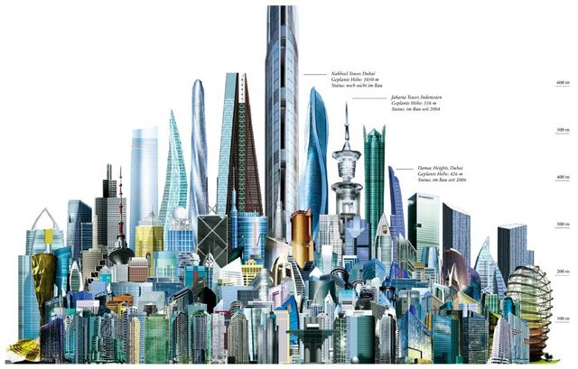 Darunter viele, die einen Superlativ verdient hätten, wie der Nakheel Tower in Dubai, der mit seinen 1050 Metern unangefochten zum höchsten Gebäude der Welt aufgestiegen wäre, aber auch zahlreiche Prestigegebäude in Europa, Nordamerika, Südamerika und Afrika. Addiert man alle derzeit stillgelegten Bauprojekte, landet man bei 42,1 Höhenkilometern, die keine Skyline mehr schmücken werden. Die Auswirkungen auf den Arbeitsmarkt im Baugewerbe sind schon jetzt enorm: Allein, dass das höchste Gebäude Südamerikas, der Gran Torre Costanera (300 Meter), vorerst nicht gebaut wird, bedeutet den Verlust von 2000 Jobs. Überträgt man den Indikator Arbeitskräfte pro Höhenmeter auf alle 198 betroffenen Hochhäuser, so ergibt sich insgesamt ein weltweiter Verlust von 280 000 Arbeitsplätzen. Die Welle an Baustopps ist also nicht nur eine architektonische und ästhetische Frage, sondern im Kern auch eine menschliche Tragödie.