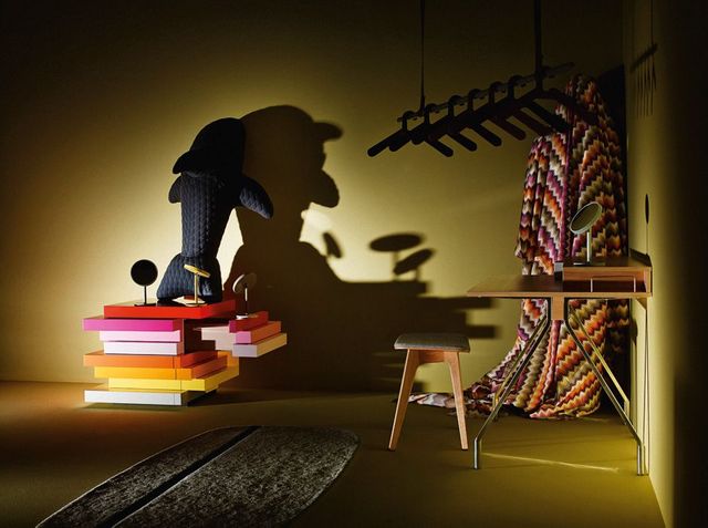 Pinocchios Geist Von links: Kommode »Mille Feuille 3« und die Standspiegel »Beauty« von Schönbuch, aufblasbarer Gummiwal aus der Kollektion »Home Zoo Covers« von Silvia Knüppel, Teppich »Oona« von Normann Copenhagen, Kleiderstange »Clothes Rack« von Ferm Living, Kleiderbügel »0115« von Schönbuch, Hocker »Morph« von Zeitraum, Bettwäsche »Patrick« von Missoni Home, Schreibtisch »Mateodesk« von Ligne Roset.