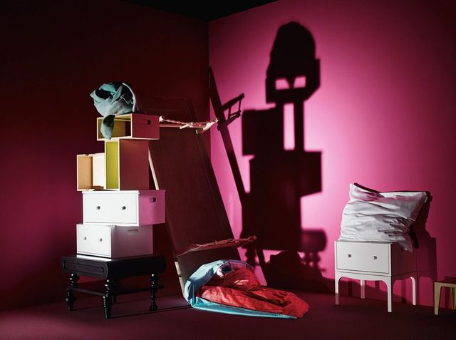 Nicht von dieser Welt Von links: Kommode »Hochstapler« aus stapelbaren Elementen, von Silvia Knüppel, Stoff »Feather« von Kinnasand (obenauf), Faltbett aus Buchenholz, von Manufactum, Bettwäsche aus der »Minimal Collection« für Hay, Kommodenelement »Hochstapler« von Sylvia Knüppel.