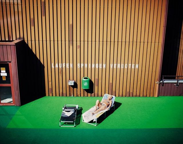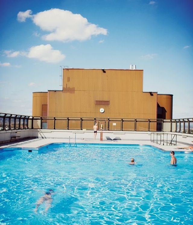 Frau Stögerer, 59, seit 28 Jahren beheimatet im 10. Stock von Block B, liegt meistens auf dem Handtuch vorn links an der Brüstung, dort wo sich das Becken etwas verengt. Sie geht früh, in der Regel um 10.30 Uhr, weil sie dann die Bahnen noch fast für sich hat und die Kinder (»Die Bakterien, waaßt?«) erst am Nachmittag einfallen. Hier oben, in rund siebzig Meter Höhe, fühlt sie sich fast wie im Himmel.