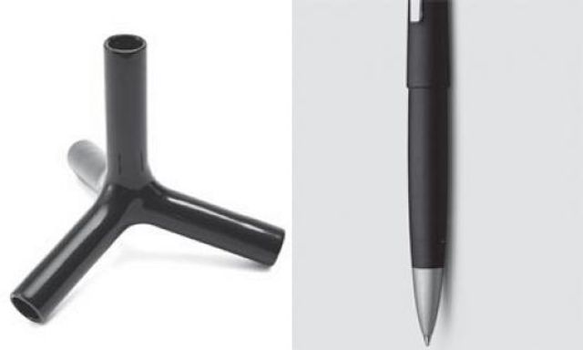 Links: 55 Vierbeiner: Den Kerzenständer »Tetra« von B_&_B Italia aus Keramik gibt es in Schwarz oder Weiß. Rechts: 45 Zurück in der Zukunft: Der »Lamy 2000« ist ein Designklassiker aus den Sechzigerjahren. Den Tintenroller mit Kappe gibt es jetzt als Jubiläumsedition.