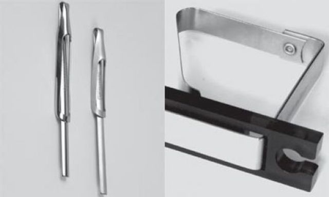 Links: 10 Klammeraffe: Der Stiftehalter »Pen Clip« aus Edelstahl von Stefan Diez für Authentics passt für alle Stiftstärken. Zum Festmachen an Sakko, Buch und Tasche. Rechts: 8 Bürohelfer: »Knicks« von Pension für Produkte wird am Tisch festgeklammert und führt Kabel ordentlich ins Unsichtbare unter die Platte.