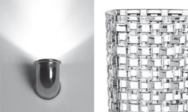 Links: 53 Lichtquell: Das Alu-Rohr »Medito« von Fontana Arte spuckt Licht aus der Wand. Rechts: 69 Mimikry: Die Vase »Crystal Basket« sieht aus wie teures Baccarat-Glas. Das platinveredelte Kristall stammt aber von Nachtmann und ist um einiges günstiger.