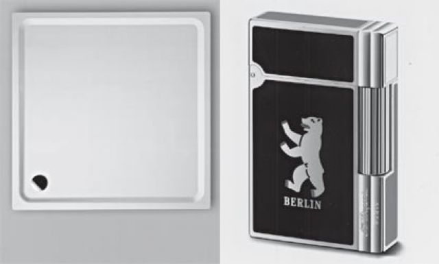 730 Leuchtreklame: Der Schmuckhersteller Wempe hat zusammen mit Dupont das Feuerzeug »Gatsby« entworfen. Auf schwarzer Oberfläche aus Chinalack erstrahlt das Wappen ausgewählter Städte: Stuttgart, Berlin, Dortmund, Dresden, Hamburg, Köln.