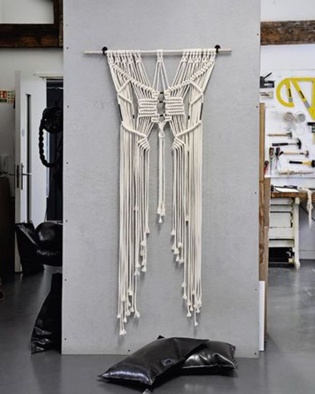 Die Idee, Wände mit Teppichen oder anderen Webarbeiten zu schmücken, scheint nicht mehr in unsere Zeit zu passen. Immer noch gilt das Primat des Minimalismus: kahle Mauern, roher Putz, kühle Strenge statt Wärme und Dekor. Dass beides sich nicht ausschließen muss, beweist dieser geknüpfte Wandschmuck der britischen Designerin Faye Toogood: Es ist eine Variation eines Wandteppichs ihrer aktuellen Möbelkollektion »Assemblage 4«. Aus 22 weißen Seilstücken und einer raffinierten (aber nicht komplizierten) Knüpfanleitung entsteht ein elegantes Ornament, das sofort die Blicke auf sich zieht. »Diese Makramee-Technik des Knotens ist eine Tradition aus der Fischerei. Fischer haben so Netze geknotet oder Ornamente, mit denen sie ihre Schiffe schmückten.«