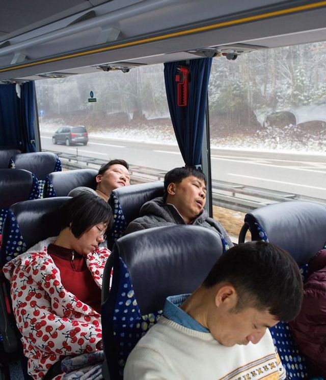 Herr Yang, der Reiseleiter, zieht einen Schnellhefter mit Vortragsmanuskripten hervor, auf denen er Stichpunkte zu Themen wie »Gesellschaft«, »Verkehr« und »Geschichte des Biers« notiert hat: »Es kann leicht passieren, dass ihr später keine Ahnung mehr habt, wo ihr überall gewesen seid«, sagt er und empfiehlt, in jeder Stadt zuerst einen Kanaldeckel mit eingraviertem Ortsnamen abzufotografieren – als Erinnerungshilfe. Sofern man sich an die Gesetze halte, sei Deutschland ein sehr freies Land, meint er, ein Land, das »mehr Steuereinnahmen für Soziales ausgibt als für Waffen« und »aus Umweltschutzgründen seine Industrie ins Ausland verlagert, zu uns zum Beispiel«. Aus materiellen Gütern mache sich das Volk nicht viel, dafür liebe es lange Urlaube, Autofahrer hupten nur selten (»Das ist hier wie schimpfen«). Außerdem seien Deutsche außergewöhnlich erfindungsreich, wie die Zahl der Patente und Nobelpreisträger beweise: »Aber sie sind sehr langsam im Kopfrechnen. Nehmt es bitte mit Geduld, wenn es an der Supermarktkasse länger dauert.» Besonders auf zwei Dinge möchte Herr Yang uns vorbereiten: »Freies WLAN gibt es so gut wie nirgendwo« – kollektives »Ooooh« – und das Essen, »ich sag’s mal so: Da sind Deutsche eher schlicht. Ihr solltet für die nächsten Tage eure Ansprüche herunterschrauben.« Bis auf wenige Ausnahmen stehen ausschließlich China-Restaurants auf dem Reiseplan.