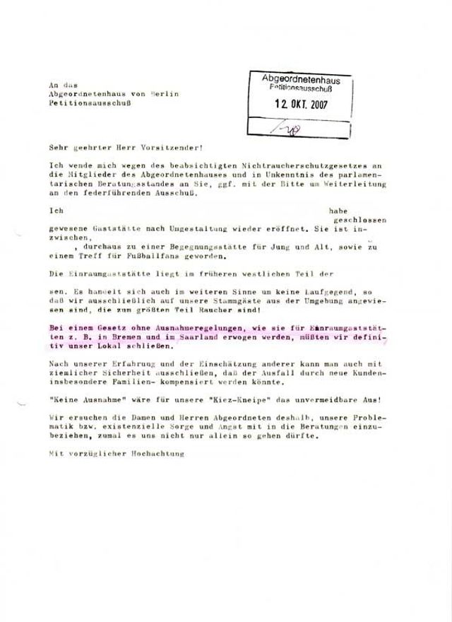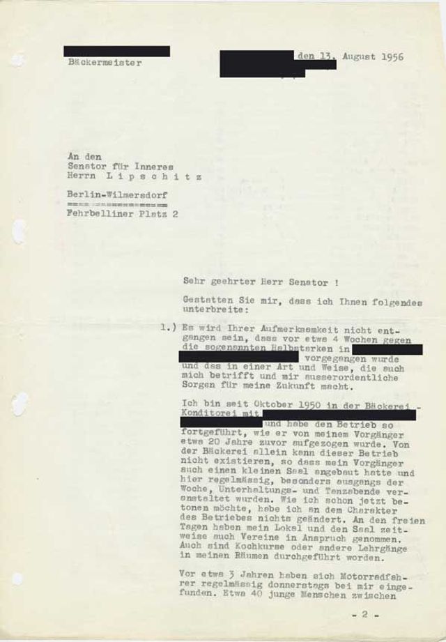 gegen die sogenannten Halbstarken in Berlin N 65, Afrikanische Strasse, vorgegangen wurde und das in einer Art und Weise, die auch mich betrifft und mir ausserordentliche Sorgen für meine Zukunft macht. (…) Vor etwa 3 Jahren haben sich Motorradfahrer regelmässig donnerstags bei mir eingefunden. Aus Gründen, die mir unbekannt sind, hat sich der Kreis dieser Jugendlichen ständig vergrössert, so dass in letzter Zeit an den Donnerstagen etwa 100 Personen einschliesslich der Damen hier waren. (…) Nachdem nun die Polizei aufkreuzte, ist mein Geschäft ausserordentlich in Mitleidenschaft gezogen worden. (…) Die erste Auswirkung zeigt sich darin, dass im Monat Juli 1956 ein Umsatzrückgang von DM 1.000,-- in Erscheinung trat. Das bedeutet, dass der aus dem Fleiss meiner Frau und mir zustehende Monatsverdienst praktisch hin ist, so dass ich um die zukünftige Entwicklung ausserordentlich besorgt sein muss. (…) Ich bitte aus diesem Grunde, mir Gelegenheit zu geben, die Dinge noch im Einzelnen mit Ihnen besprechen zu dürfen, und wäre Ihnen außerordentlich dankbar, wenn die Bearbeitung und Erledigung meiner Eingabe schnellstens eine Antwort einbringen könnte. Hochachtungsvoll!