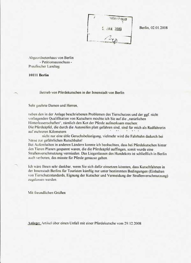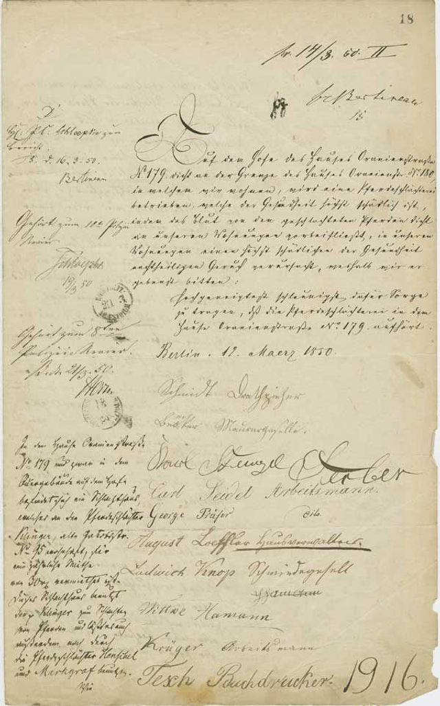 Auf dem Hofe des Hauses Oranienstraße No. 179, dicht an der Grenze des Hauses Oranienstr. No 180, in welchem wir wohnen, wird eine Pferdeschlächterei betrieben, welche der Gesundheit höchst schädlich ist, indem das Blut von den geschlachteten Pferden dicht an unseren Wohnungen vorbeifließt, in unseren Wohnungen einen höchst schädlichen, der Gesundheit nachtheiligen Geruch verursacht, weshalb wir ergebenst bitten: Hochgeneigtest schleunigst dafür Sorge zu tragen, daß die Pferdeschlächterei in dem Hause Oranienstraße No. 179 aufhört.