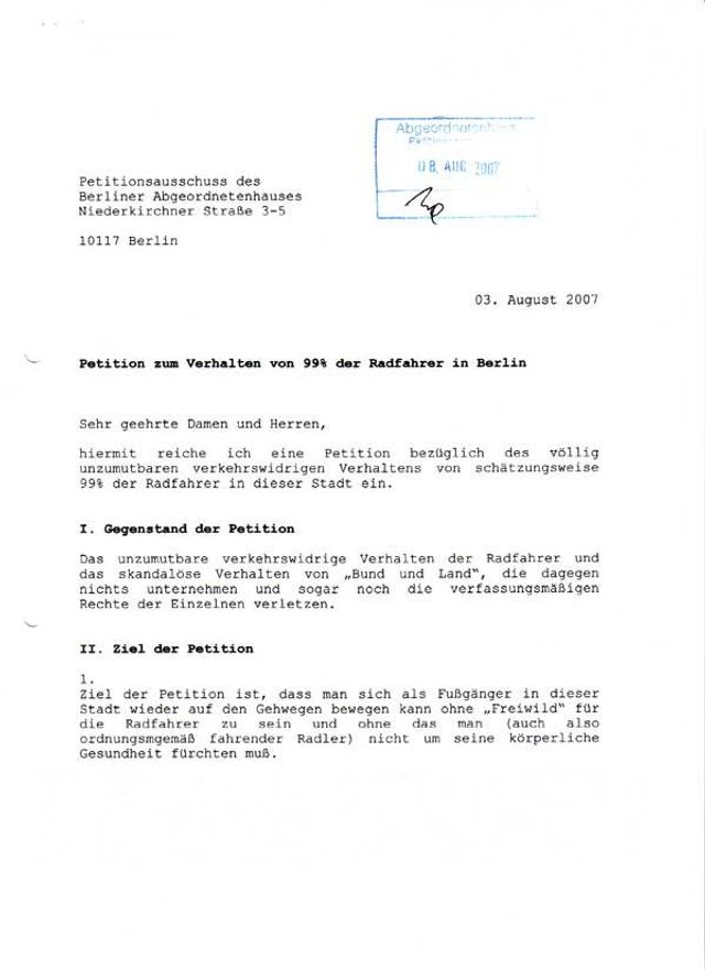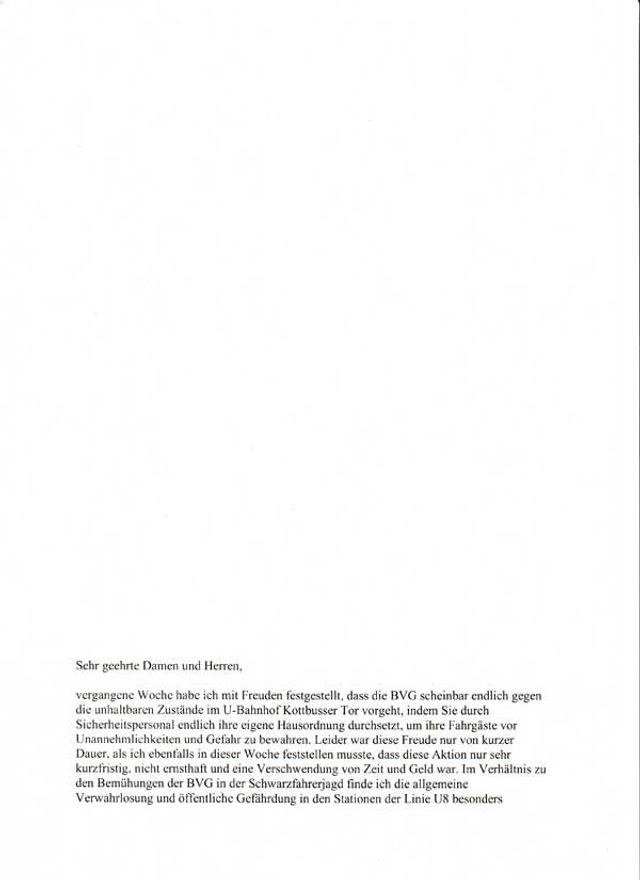 BVG = das ist ein Saftladen = so, wie die BVG geleitetet wird = das kann sich kein ordentlicher Kaufmann erlauben, dann ist er pleite. Warum beteiligen sich die Chefs und Angestellten nicht an den Fahrtkosten incl. Ehegaten = wo gibt es noch solche Privilegien für Angestellte? Dann bekommen die Rentner noch Weihnachtsgeld! Dieser alte Zopf muß ab, dann fährt die BVG auch wieder schwarze Zahlen ein. (…)Archivrecherche: Martin Langeder und Jürgen Waechter. Dank an Ingrid Lokoschus, Gisela Hunger, Sabine Preuß vom Landesarchiv Berlin, Andreas Psiorz von der Berliner Senatskanzlei, Cornelia Albers und Carol Bosenius vom Petitionsausschuss des Berliner Abgeordnetenhauses.