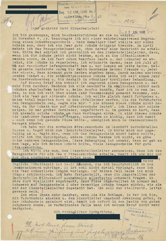 Ich bin gezwungen, mich beschwerdeführend an Sie zu wenden. Im November v. Js. beantragte ich mit einer wahrheitsgetreuen Begründung einen Schuhbezugsschein. Mein damaliger Chef stellte mir einen Schein aus, dass ich ein Paar gute Schuhe dringend brauche. Im April mahnte ich das Bezugsscheinamt an, ohne darauf eine Nachricht zu erhalten. Mitte Mai schrieb ich persönlich an den Dienststellenleiter, dass, wenn ich die Schuhe jetzt nicht bekäme, mich an die Öffentlichkeit wenden würde, da ich fast schon barfuss laufe. Ich erinnerte daran, dass ich Juli 45 aus russischer Gefangenschaft kam u. nur Lumpen am Leibe hatte. (…) Ich wäre Ihnen sehr dankbar, wenn Sie die Notlage mit Verständnis ansehen u. dem Dienstleiter umgehend Anweisung geben, damit ich sofort in den Besitz von gutem Schuhwerk komme. Im verneinenden Falle kann ich meinem Beruf nicht mehr nachgehen.