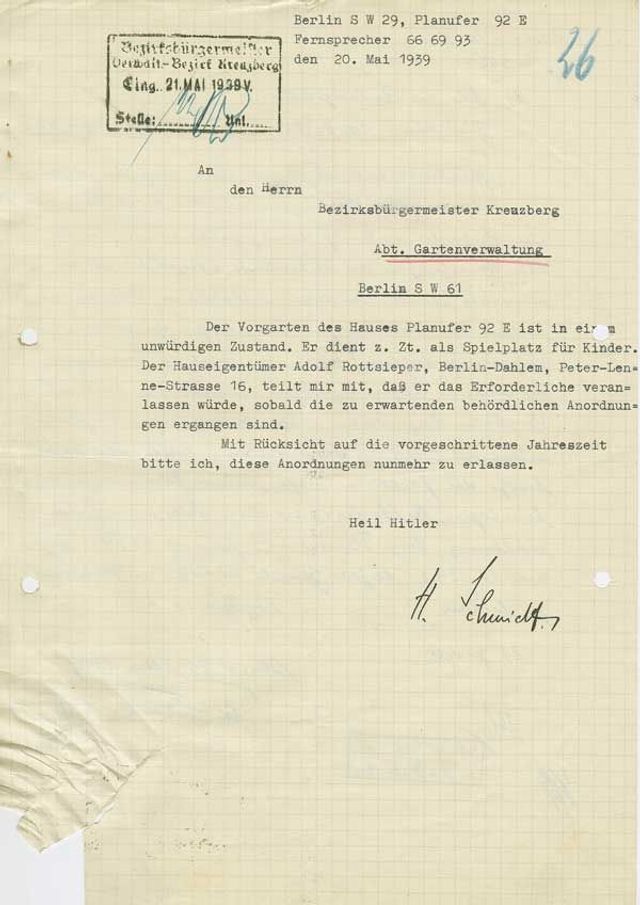 Der Vorgarten des Hauses Planufer 92 E ist in einem unwürdigen Zustand. Er dient z. Zt. als Spielplatz für Kinder. Der Hauseigentümer Adolf Rottsieper, Berlin-Dahlem, Peter-Lenne-Strasse 16, teilt mir mit, daß er das Erforderliche veranlassen würde, sobald die zu erwartenden behördlichen Anordnungen ergangen sind.