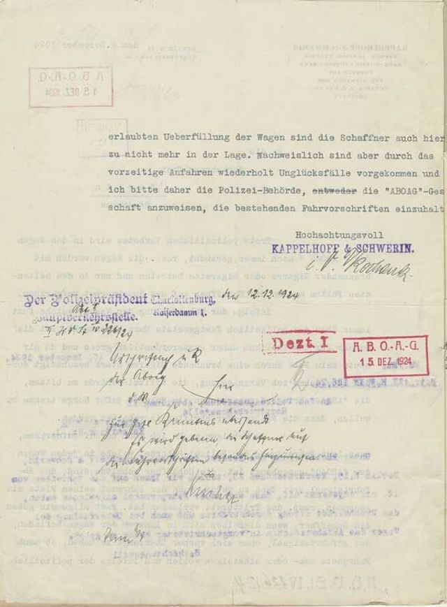 Im Übrigen mache ich noch darauf aufmerksam, dass laut Fahrordnung der Polizeibehörde die Schaffner gehalten sind, das Abfahrtssignal erst dann zu geben, wenn der Fahrgast seinen Platz eingenommen resp. das Trittbrett verlassen hat. Fast allgemein geben die Schaffner, wenn dieselben sich im Inneren der Wagen befinden, das Abfahrtssignal, ohne sich vorher überzeugt zu haben, ob noch Fahrgäste aus- oder einsteigen wollen und infolge der polizeilich erlaubten Überfüllung der Wagen sind die Schaffner auch hierzu nicht mehr in der Lage. (…)