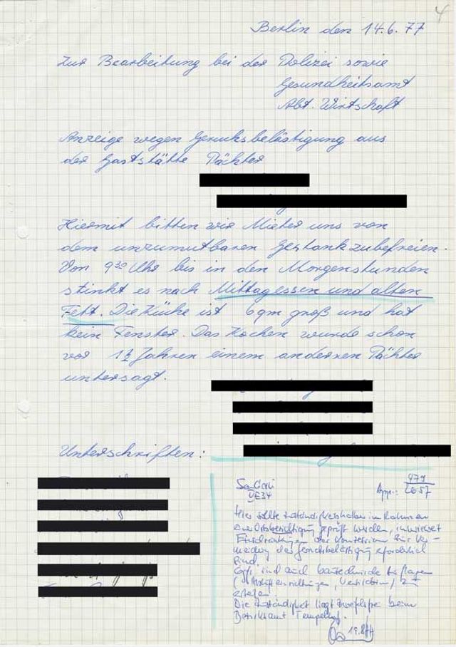 Hiermit bitten wir Mieter, uns von dem unzumutbaren Gestank zu befreien. Von 9.30 Uhr bis in den Morgenstunden stinkt es nach Mittagessen und altem Fett. Die Küche ist 6 qm groß und hat kein Fenster. Das Kochen wurde schon vor 1 1/2 Jahren einem anderen Pächter untersagt.